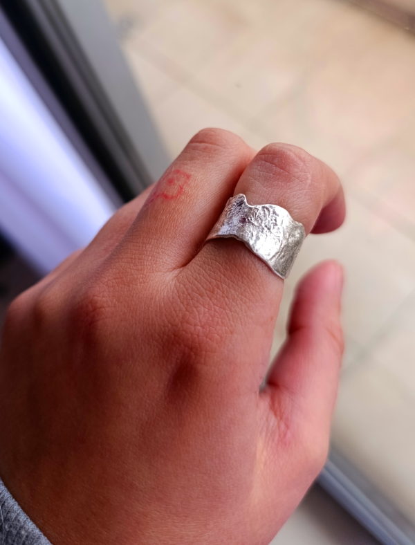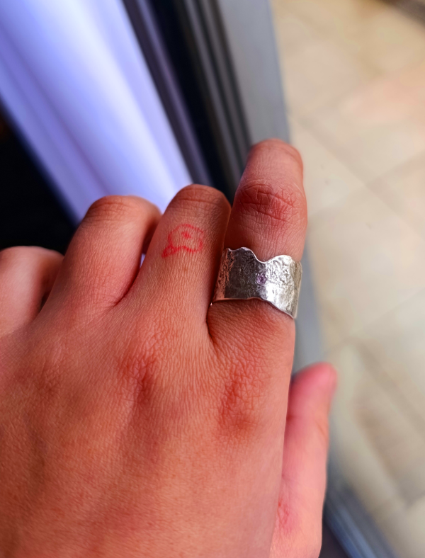 Anillo de Plata 925 irregular con textura. Es abierto para regular la medida de acuerdo a cada persona. Tiene una piedra pequeña en el frente, engastada mediante la técnica pavé.